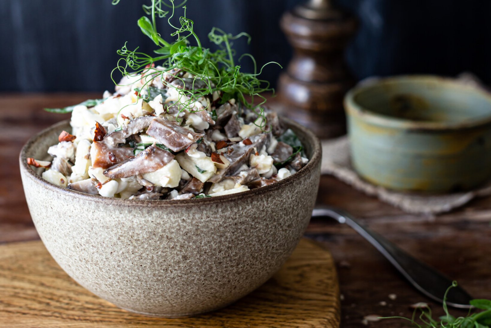 Kupata seened. Jahuta, seejärel haki peeneks. Koori ja tükelda õun. Sega kõik salatikomponendid omavahel. Maitsesta soola ja pipraga.