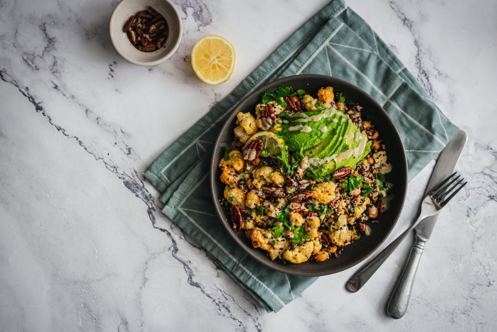 Lõika lillkapsas õisikuteks, tõsta ahjuplaadile. Lisa nõrutatud kikerherned, vürtsköömned ja paprikapulber. Maitsesta soola-pipraga ja nirista kogu segu üle oliiviõliga. Sega kõik kokku ja küpseta 200 kraadi juures umbes 20–25 minutit.
