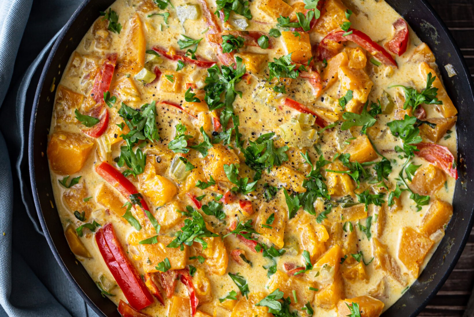 Haki sibul ja prae pannil klaasjaks. Poole küpsemise pealt lisa viilutatud sellerivarred. Nüüd lisa paprikatükid. Sega juurde karri, Cayenne’i pipar, petersell ja maitsesta soola-pipraga. Pane juurde kõrvitsakuubikud. Kalla sekka puljong ja kohvikoor. Lase madalal kuumusel 10−15 minutit podiseda. Kõrvits peab jääma pehme, aga mitte lödi. Maitsesta lõplikult ja serveeri!