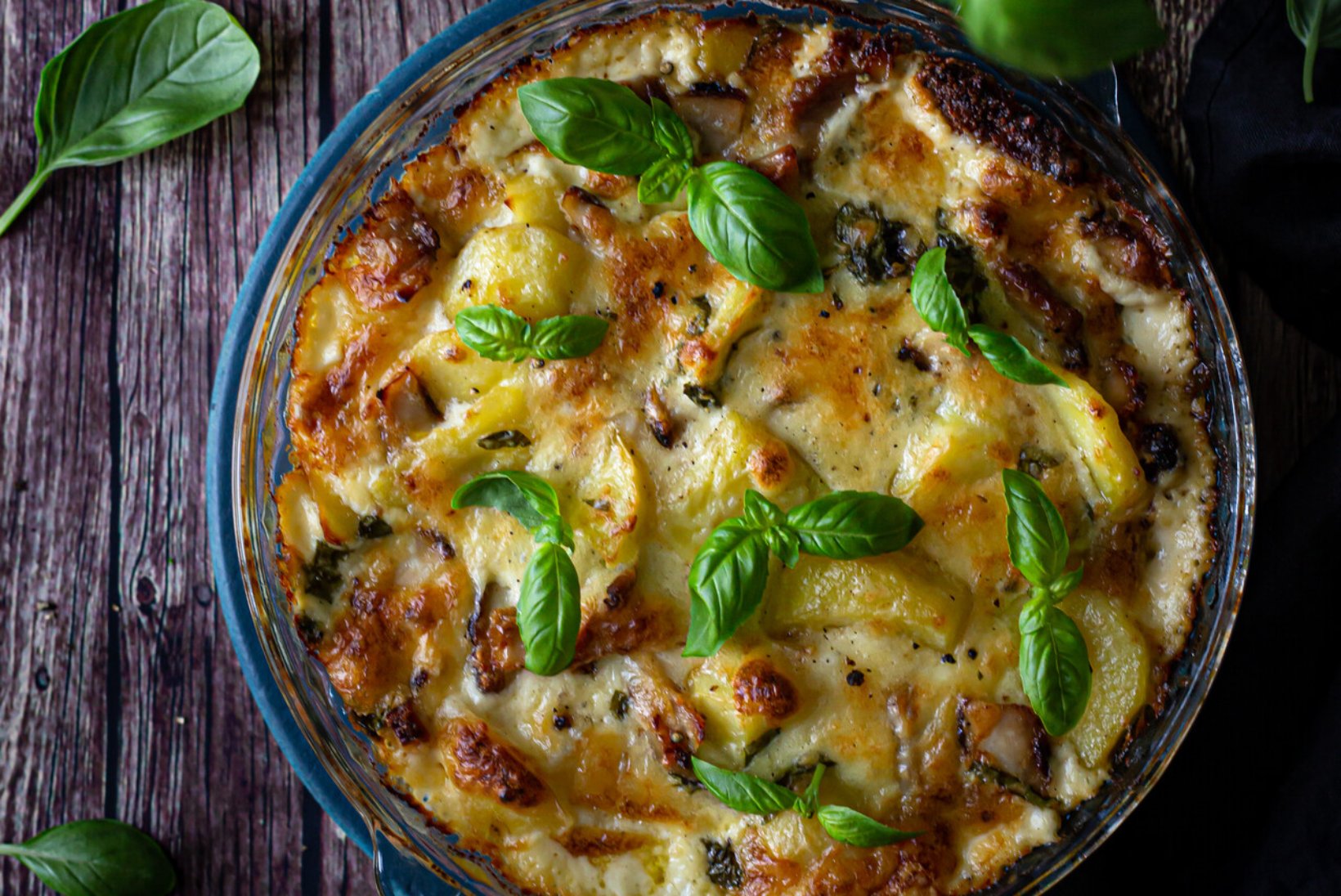 Lisa küpsetatud kartulid ja tükeldatud liha kooresegusse. Sega läbi. Tõsta segu võiga määritud ahjuvormi. Küpseta 200 kraadi juures 15−20 minutit.